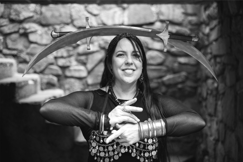 – As a belly dancer, I would like to discuss my preferences for dance a little more extensively. The veil, basket and fan are a few fun props I like to use when I’m on stage but dancing with a sword is my absolute favorite. Not long ago, I participated in a double sword intensive training. During that time, I gained the ability to balance both swords on my head while dancing and spinning. It’s been one of the most rewarding challenges for me as a dancer.